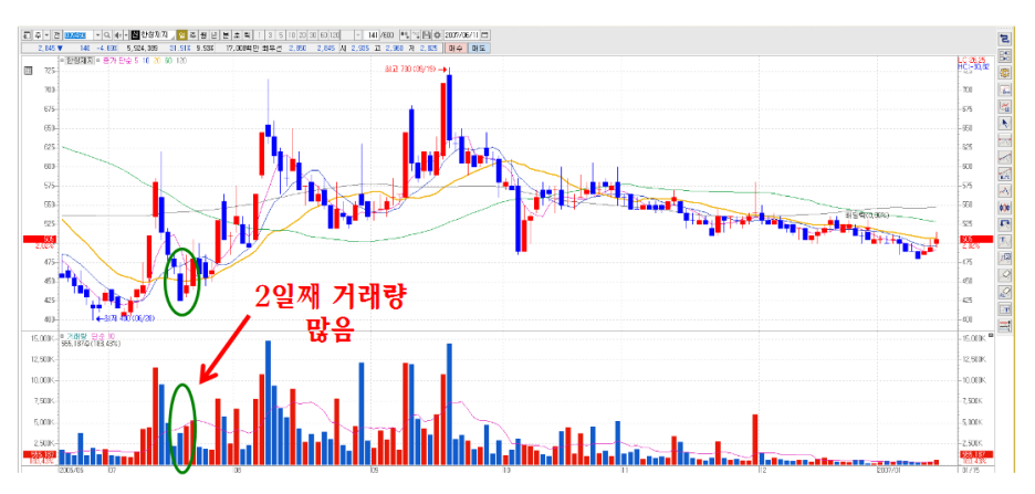 - 2일째 양봉이 첫음봉보다 거래량 2~3배 정도 증가 : 최상의 신뢰도