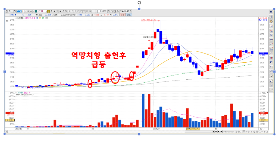 - 거래량이 2~3배 소폭 증가된 역망치형(매수 타이밍) : 5배 이상 증가는 당기 매수세가 빠져 나간 신호, 하락 주의