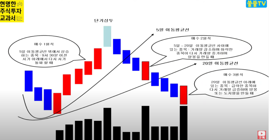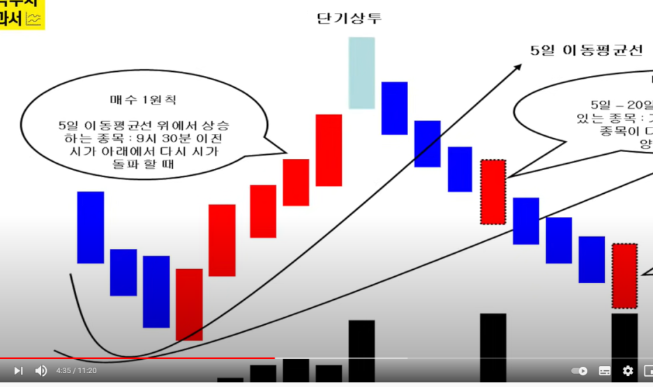 - 아무리 강한 종목이라 하더라도, 아침에 시초가에서 밀리고 다시 상승한다. 밀리는 때를 매수 타이밍으로