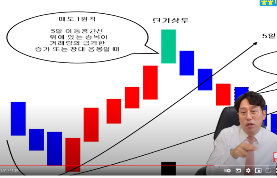 - 5일 이동평균선 위에 있는 종목이 거래량이 급격하게 증가하면서 도지형 또는 장대 음봉이 나올 때